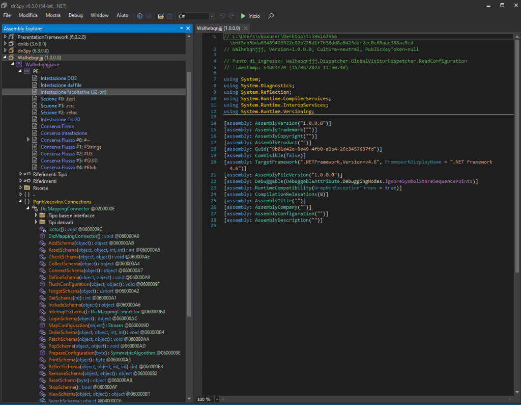 DnSpy permette infatti di decompilare facilmente gli assembly .NET, consentendo agli sviluppatori di esaminare il codice sorgente originale del sample .NET. È infatti sufficiente aprire un sample .NET con DnSpy per avere libero accesso al codice sorgente totalmente decompilato.