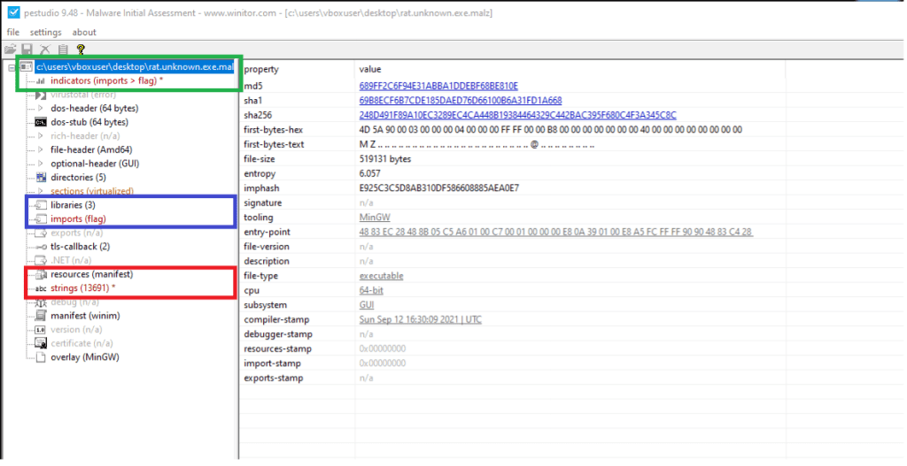 Tramite PeStudio è possibile esaminare in modo statico i file fornendo informazioni dettagliate sui metadati, le librerie dinamiche, i certificati digitali e altro ancora. Questa analisi statica aiuta a individuare rapidamente eventuali indicatori di compromissione presenti all’interno di un malware.
