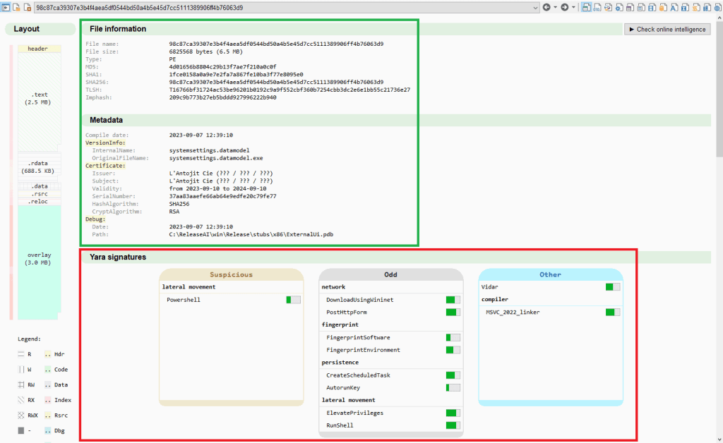 Tra le varie fantastiche funzioni di questo tool, come la visualizzazione dell’hex, il disassembler, la funzione di Threat Intelligence (quest’ultima purtroppo non disponibile nella versione free) e la possibilità di lanciare script Python direttamente sul sample in analisi, è anche presente la possibilità di importare Yara Rules che verranno lanciate automaticamente sull’eseguibile in analisi.