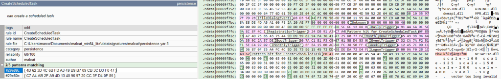 Proviamo ora ad andare a visualizzare uno dei match individuati dal software, guardiamo, ad esempio, la Yara Rules che ricerca la creazione di Schedule Task da parte di un sample: