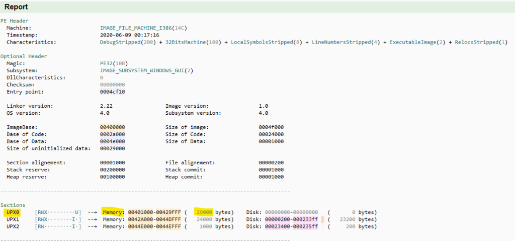 La sezione UPX0 è una sezione vuota che non contiene dati, ma che ha un’enorme dimensione di memoria virtuale; questo si può vedere molto bene nella sezione “Report” sotto riportata.