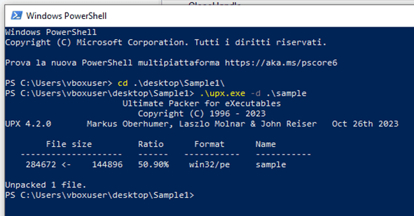 Una volta scaricato UPX lanciamo semplicemente il comando upx.exe -d sul sample e in pochi attimi avremo il sample non più packed:
