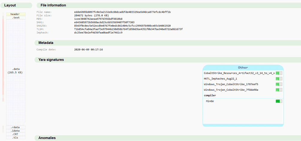 Notiamo subito che, al contrario di prima, le Yara Rules hanno effettuato il match su alcune parti di file, suggerendo che il sample che stiamo analizzando è inerente a CobalStrike.
