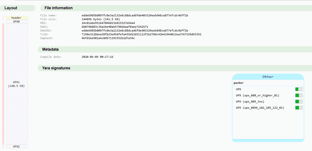 Notiamo subito come le Yara Rules eseguite sul file non trovano nessun IoC ma identificano solo il packer del sample.