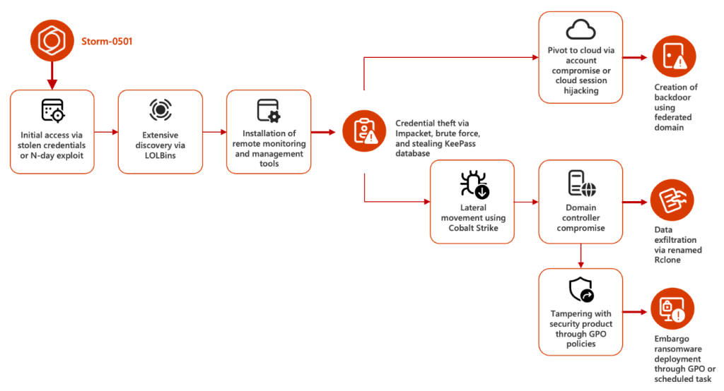 Il gruppo Storm-0501 è emerso per la prima volta nel 2021 come affiliato all’operazione ransomware Sabbath. Successivamente, ha iniziato a distribuire malware provenienti dalle gang Hive, BlackCat, LockBit e Hunters International.