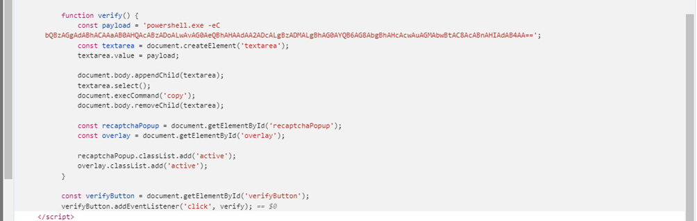 Il codice della pagina web rivela un payload incorporato all’interno di codice javascript offuscato, in cui una funzione denominata “verify” contiene uno script PowerShell codificato in Base64 che viene copiato negli appunti quando si preme il pulsante: “I’m not a robot”.