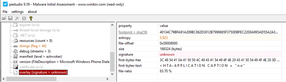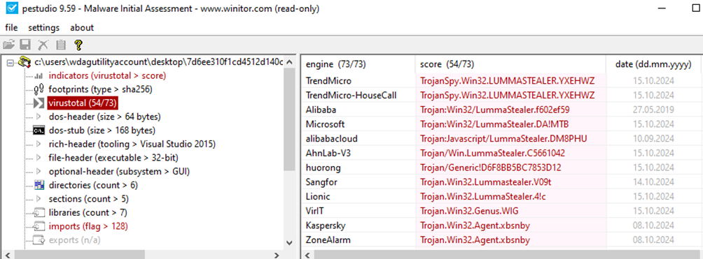 “hxxp://myappt67[.]s3.amazonaws[.]com/pgrtrx” Questo URL punta a un file ospitato su Amazon S3 (un servizio di archiviazione di file su cloud). Il file in questione costituisce il payload dello stealer. Analizzandolo con Pestudio, si evidenzia che l’eseguibile non è firmato e che diversi vendor di sicurezza lo hanno già identificato e segnalato.