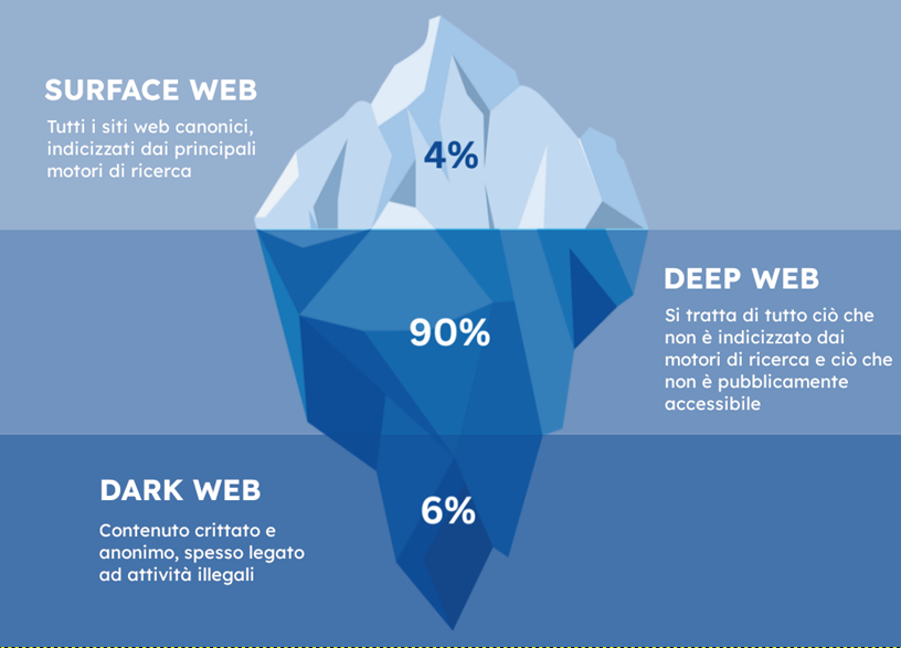 Il dark web è una parte nascosta di internet, non indicizzata dai motori di ricerca tradizionali come Google. Per accedervi è necessario utilizzare software specifici, come il browser Tor, che offrono anonimato e permettono di visualizzare contenuti accessibili solo attraverso connessioni cifrate.