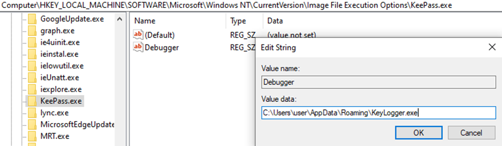 Tuttavia, un attaccante può abusare della chiave di registro IFEO per eseguire un malware al posto di un debugger legittimo. Ad esempio, potrebbe configurare un keylogger per registrare le sequenze di tasti dell’utente e inviarle a un server Command & Control ogni volta che viene avviato un programma di gestione password, come “KeePass”. Per evitare sospetti, l’attaccante potrebbe programmare il malware in modo da eseguire anche il software originale, passato come argomento, facendo sembrare il tutto come un normale avvio del programma atteso dall’utente.