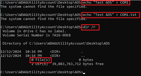 echo “Test ADS” > \\?\PATH_FILE\COM1.TXT type \\?\PATH_FILE\COM1.TXT