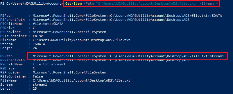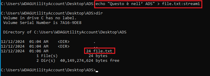 Se si esegue il comando DIR prima e dopo la creazione dell’ADS, file.txt continuerà a mostrare la stessa dimensione (24 byte nell’esempio). Questo perché gli ADS non incidono sulla dimensione visibile del file principale.
