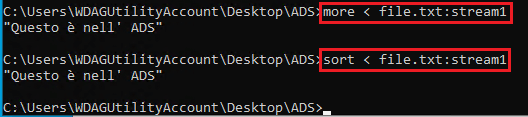 - Il secondo comando crea un flusso di dati alternativo associato allo stesso file, denominato stream1, e vi inserisce la stringa: “Questo è nell’ADS”.