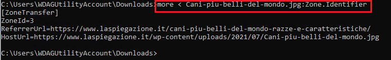 Gli ADS consentono di nascondere dati aggiuntivi all’interno di un file. Un esempio pratico di utilizzo è il flusso Zone.Identifier, utilizzato da Microsoft per identificare la provenienza di un file. Questo flusso può contenere informazioni come la zona di sicurezza da cui proviene il file (es. Internet). Vediamo un esempio.