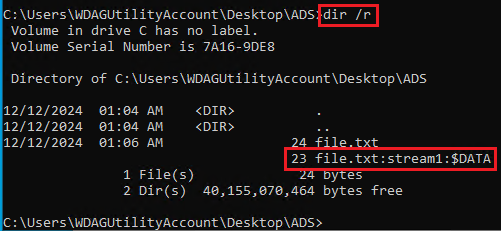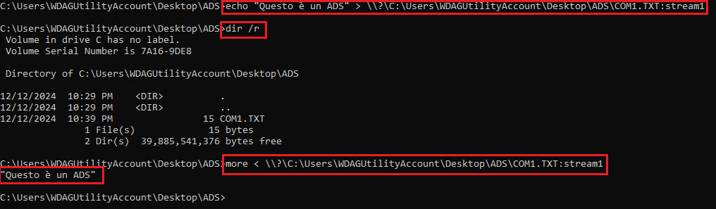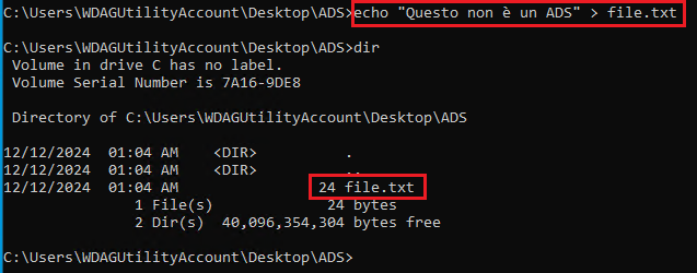 Se si esegue il comando DIR prima e dopo la creazione dell’ADS, file.txt continuerà a mostrare la stessa dimensione (24 byte nell’esempio). Questo perché gli ADS non incidono sulla dimensione visibile del file principale.