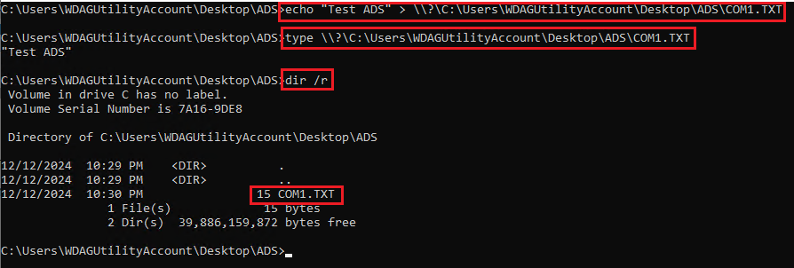 echo “Test ADS” > \\?\PATH_FILE\COM1.TXT type \\?\PATH_FILE\COM1.TXT