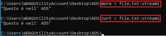- Il secondo comando crea un flusso di dati alternativo associato allo stesso file, denominato stream1, e vi inserisce la stringa: “Questo è nell’ADS”.