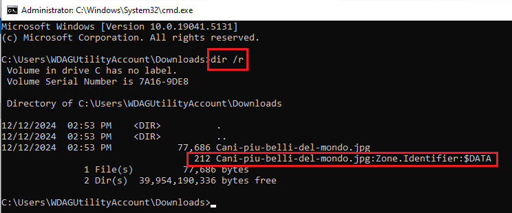 Gli ADS consentono di nascondere dati aggiuntivi all’interno di un file. Un esempio pratico di utilizzo è il flusso Zone.Identifier, utilizzato da Microsoft per identificare la provenienza di un file. Questo flusso può contenere informazioni come la zona di sicurezza da cui proviene il file (es. Internet). Vediamo un esempio.