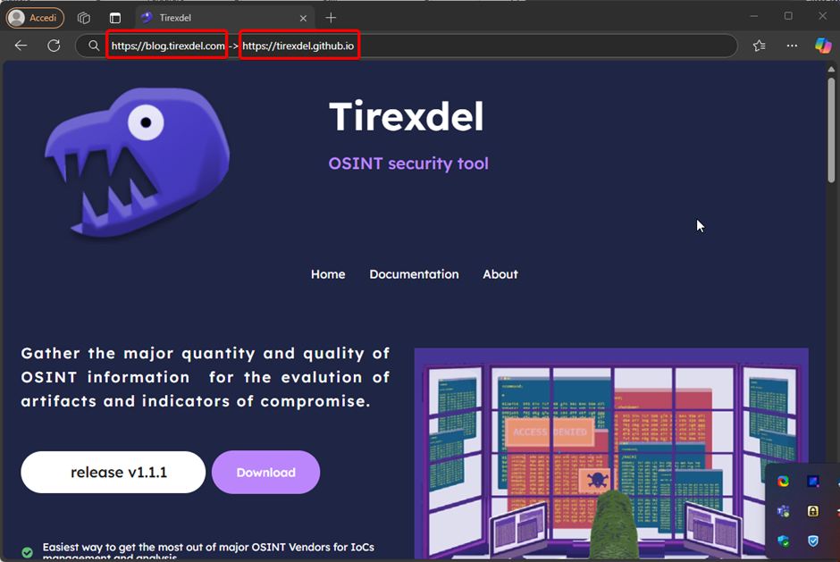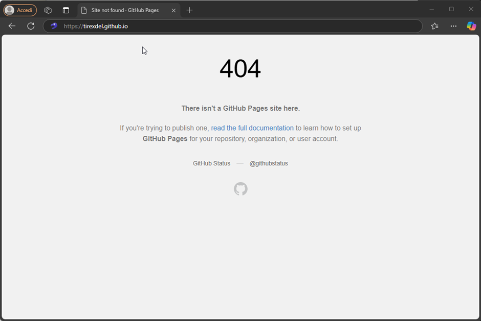 - Conferma della vulnerabilità: L’attaccante verifica che il repository GitHub associato non esista più. Questo può essere fatto visitando direttamente tirexdel.github.io, che restituirà un errore 404.