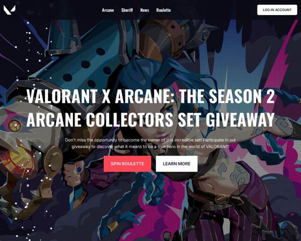Ad esempio, è stato individuato un sito di phishing che imitava in modo convincente una campagna ufficiale di Riot Games, progettata per unire l’universo del gioco Valorant e quello della serie animata Arcane. Gli utenti erano invitati a “far girare la ruota” per vincere skin esclusive. In realtà, i partecipanti fornivano inconsapevolmente le credenziali dei propri account di gioco, dati bancari e numeri di telefono a terze parti, senza ricevere alcuna ricompensa.