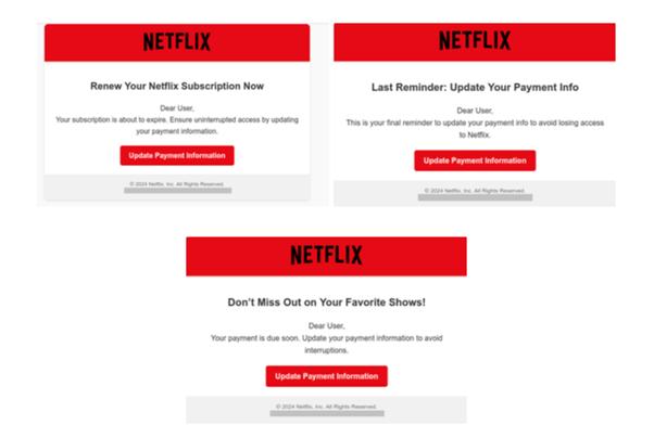 Tra le piattaforme più sfruttate figurano, oltre a Netflix, Amazon Prime Video, Disney+, Apple TV+ e HBO Max. Le campagne di phishing sono state costanti nel tempo, senza picchi o cali significativi, e si sono basate principalmente su tecniche classiche: invio di link a siti di phishing che imitano i portali ufficiali, spesso mascherati da richieste di rinnovo dell’abbonamento o aggiornamento dei dati di pagamento. Le comunicazioni fraudolente replicavano lo stile visivo dei brand, rendendo difficile individuare l’inganno.