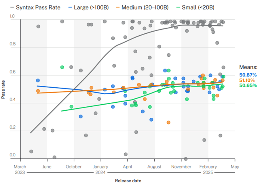 Come illustrato nel grafico sottostante, sebbene i modelli abbiano fatto progressi significativi nella generazione di codice sintatticamente corretto, le prestazioni in termini di sicurezza non presentano miglioramenti. Infatti, oltre il 90% del codice prodotto dagli LLM rilasciati nel 2025 è risultato compilabile – un netto miglioramento rispetto al 20% risalente a giugno 2023 – ma solo il 55% ha superato con successo i controlli di sicurezza successivi. In altre parole, nel 45% dei casi, i modelli hanno introdotto vulnerabilità di sicurezza appartenenti alla top 10 OWASP.