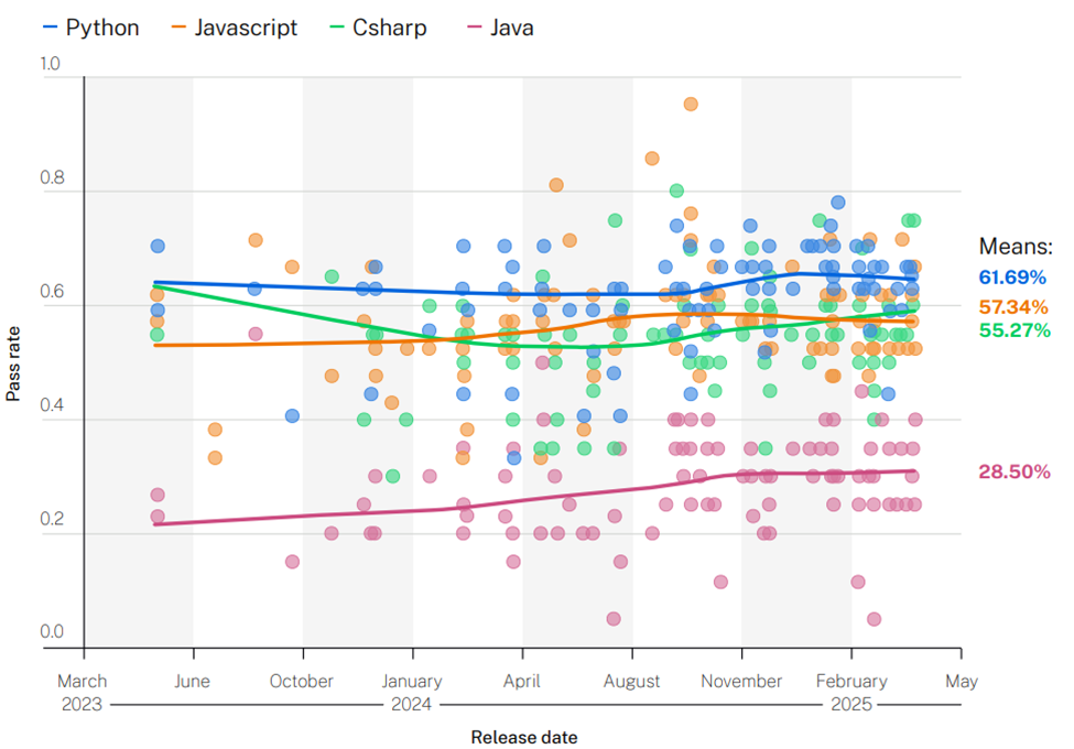 Come illustrato nel grafico sottostante, sebbene i modelli abbiano fatto progressi significativi nella generazione di codice sintatticamente corretto, le prestazioni in termini di sicurezza non presentano miglioramenti. Infatti, oltre il 90% del codice prodotto dagli LLM rilasciati nel 2025 è risultato compilabile – un netto miglioramento rispetto al 20% risalente a giugno 2023 – ma solo il 55% ha superato con successo i controlli di sicurezza successivi. In altre parole, nel 45% dei casi, i modelli hanno introdotto vulnerabilità di sicurezza appartenenti alla top 10 OWASP.