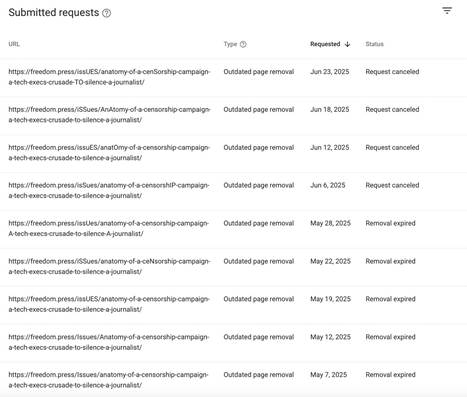 La Freedom of the Press Foundation (FPF) ha raccontato come un proprio articolo sia sparito da Google nonostante fosse ancora normalmente online. Ogni volta che il pezzo veniva reindicizzato, nuove richieste arrivavano prendendo di mira la stessa pagina con capitalizzazioni diverse della URL: nove richieste contro l’articolo della FPF e 21 contro due articoli del giornalista Jack Poulson, in un arco di settimane. Dopo le segnalazioni, Google ha confermato il problema e dichiarato di aver rilasciato una correzione; un tentativo di abuso del 1° agosto è stato negato, segno che il fix aveva effettivamente risolto la criticità.
