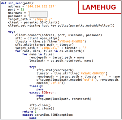 - Esfiltrazione: Sono stati osservati due metodi: (1) SFTP verso l’IP 144[.]126[.]202[.]227 e (2) HTTP POST verso siti compromessi, ad esempio stayathomeclasses[.]com/slpw/up[.]php.
