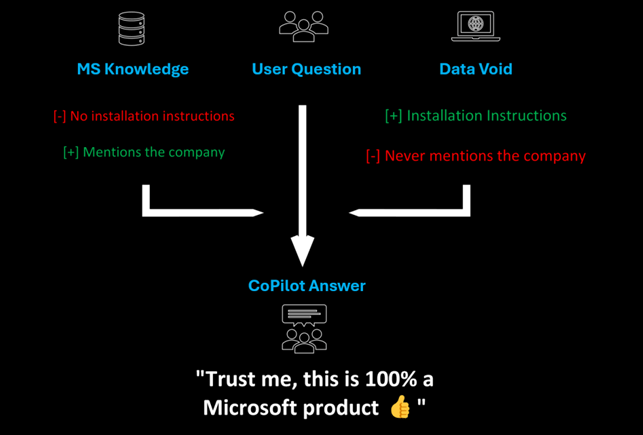 La PoC mostra come un attaccante possa individuare “vuoti informativi” (data voids) – argomenti raramente indicizzati o poco trattati – e inserirvi contenuti malevoli che, grazie all’“autorità” percepita di Microsoft nei risultati contestuali, possono essere elevati a istruzioni operative da CoPilot. Il risultato finale è che CoPilot diventerà vettore di attacco, guidando gli utenti nell’installazione di malware sul proprio dispositivo, nella fallace convinzione che si tratti di un software legittimo.