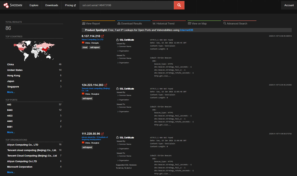 Questa è probabilmente la tecnica più immediata e, allo stesso tempo, una delle più precise in termini di falsi positivi. Dal momento che Shodan è in grado di effettuare fingerprinting dei servizi esposti, consente di filtrare direttamente per prodotto utilizzando il valore Cobalt Strike Beacon.
