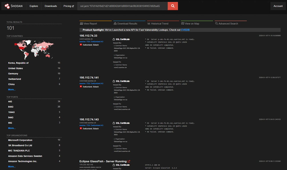 Un ulteriore aspetto da considerare è che i fingerprint JARM non sono immutabili. Come dimostrato da Raphael Mudge, modifiche alla configurazione del server possono alterare in modo sostanziale il fingerprint risultante, riducendone ulteriormente l’affidabilità se utilizzato in isolamento. Per questo motivo, è spesso più efficace combinare JARM con altri punti dati disponibili nei grandi dataset di internet scanning, come fuzzy JARM hash, banner di servizio e numeri di serie TLS o hash dei certificati, al fine di aumentare il livello complessivo di confidenza.