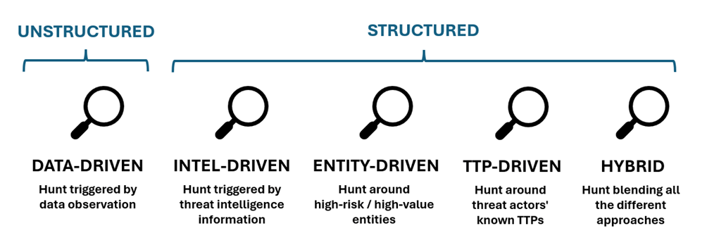 Il team di Sqrrl ha individuato cinque differenti tipologie di Threat Hunting: data-driven, intel-driven, entity-driven, TTP-driven e hybrid.