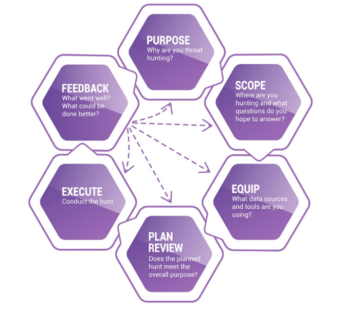 Feedback: Questa fase è correlata a tutte le fasi precedenti. L’analisi dei risultati consente al team di svolgere future attività di hunting con maggiore efficienza. L’obiettivo della fase di feedback è il miglioramento continuo di tutte le fasi precedenti; essa permette di identificare non solo se gli obiettivi siano stati raggiunti, ma anche eventuali bias in cui il team possa essere incorso, possibili lacune di visibilità e di raccolta dei dati da correggere, nonché la corretta allocazione delle risorse, e così via.