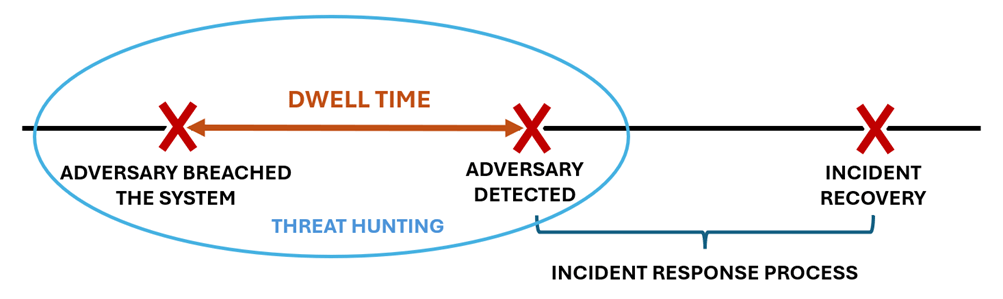 L’obiettivo principale di un threat hunter è identificare una compromissione nel minor tempo possibile, al fine di ridurne l’impatto e minimizzare il dwell time. Quest’ultimo rappresenta l’intervallo di tempo che intercorre tra il momento in cui un attaccante riesce a infiltrarsi in una organizzazione e quello in cui viene rilevato. Secondo Mandiant nel 2024 il dwell time è stato di 11 giorni (https://cloud.google.com/blog/topics/threat-intelligence/m-trends-2025 ).
