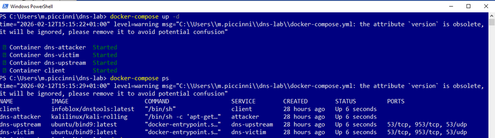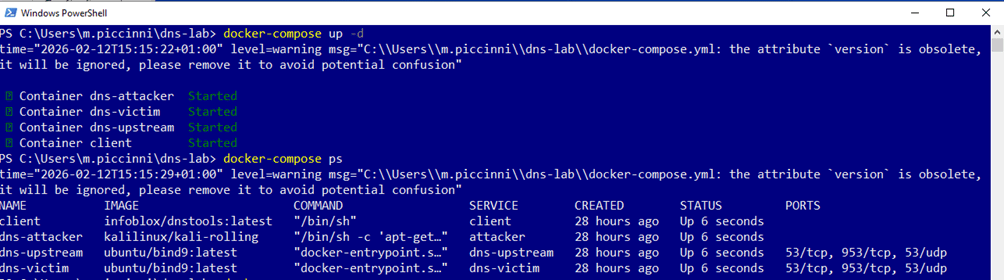 L’intero environment viene orchestrato tramite Docker Compose. All’interno della directory del progetto è presente un file docker-compose.yml che definisce i quattro container dns-victim, dns-upstream, attacker e client, la loro configurazione di rete interna e le dipendenze reciproche.