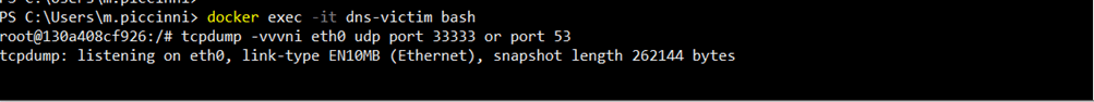 L’environment è operativo e tutti i nodi sono correttamente configurati per lo scenario offensivo. Prima di lanciare l’attacco, avviamo una sessione di tcpdump sul dns-victim questo ci permetterà di osservare in tempo reale il traffico in ingresso durante il flooding, verificando sia le query legittime provenienti dal client sia la tempesta di pacchetti falsificati generata dall’attaccante: