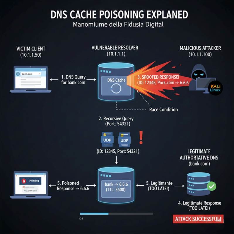 L’attacco sfrutta una finestra temporale: quando il resolver non trova una risposta in cache, invia una query UDP e resta in ascolto. In quel lasso di tempo, un attaccante può fare tre cose. Prima, stimolare la query richiedendo la risoluzione di un dominio non ancora cachato. Poi, inondare il resolver di risposte falsificate, spacciandosi per il nameserver autoritativo, prima che arrivi quella legittima. Infine, passare il controllo di validazione: se la risposta falsa contiene il query ID corretto, il resolver la accetta senza ulteriori verifiche.